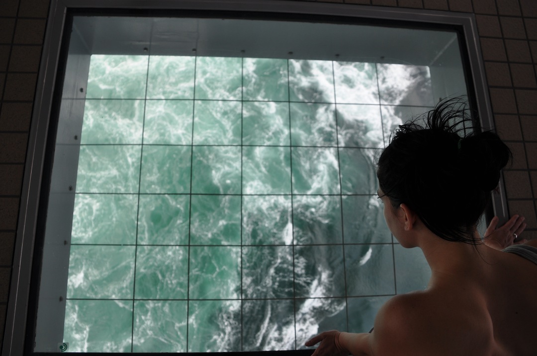 Para admirarlos recorrimos a pie el Uzu-no-michi, una pasarela de 450 m que discurre por debajo de Naruto-Ohashi, y a 45m por encima de los remolinos. Este fenómeno ocurre dos veces al día y antes de ir es mejor mirar la previsión horaria para ese día, cosa que nosotros no hicimos >_< Llegamos a medio día, minutos después de que hubieran aparecido los remolinos de mayor tamaño, pero de todas formas entramos a la pasaela y pudimos observar pequeños remolinos desde los ventanales que hay en el suelo. Al salir, el hombre de la entrada nos regaló unas postales de los remolinos, para que nos llevarámos un recuerdo visual de ellos ^^