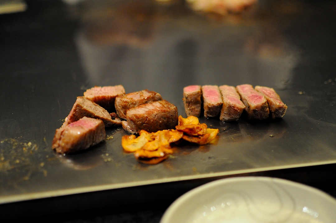 El Restaurante Misono fue el que elegimos para darnos el homenaje y disfrutar de una buena cena a base de carne. El sitio es pequeño, estilo teppanyaki, con un cocinero para nosotros y la barra delante, donde nos preparó la excelente carne delante nuestro. Probamos dos tipos de carne, el famoso buey de Kobe, y una ternera Wagyu propia del restaurante, de buenísima categoría pero sin tener el sello de carne de Kobe. Decir que las dos carnes estaban espectaculares es quedarse corto. Lo pagamos, pero disfrutamos como enanos... いただきます!